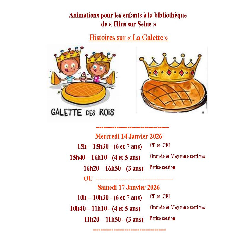 Le marcredi 14 et le samedi 17 janvier la bibliothèque organise des lectures pour enfants sur le thème de la galette !